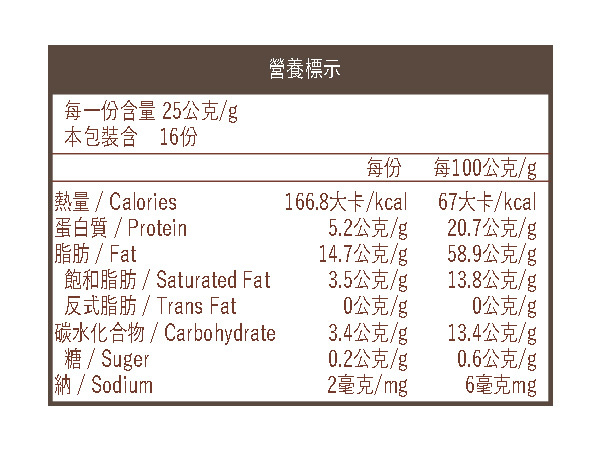 100%天然、無人工香料、無色素、無防腐劑、低溫烘焙不燥熱,保留天然營養、美味不流失,是男女老少皆宜的養生食品。