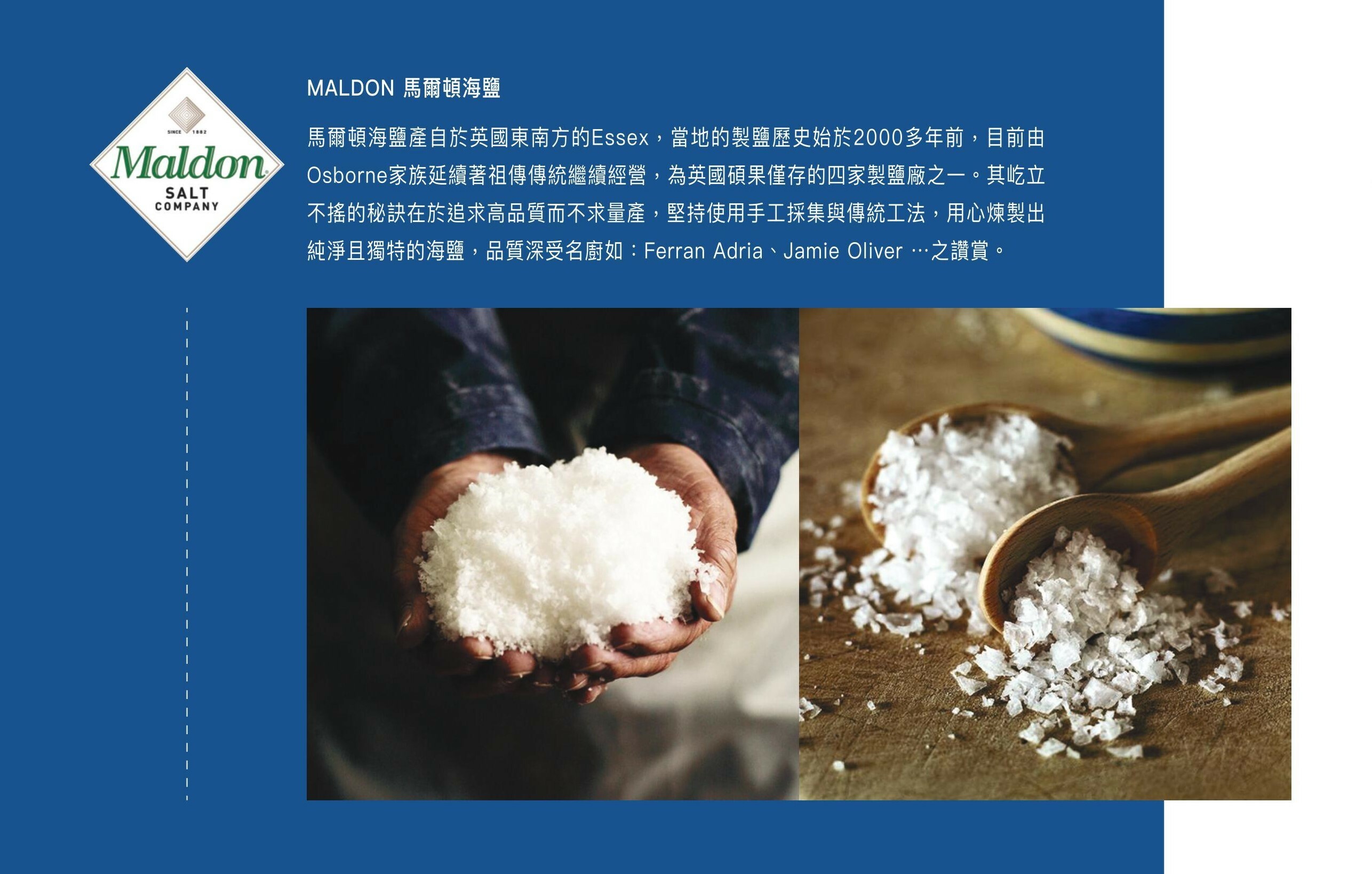 馬爾頓天然海鹽產自位於英國東南方的 Essex,當地已有2000多年的製鹽歷史,目前由Osborne 家族延續著祖先遺留下的傳統繼續經營,為英國碩果僅存的四家製鹽廠之一。其屹立不搖的秘訣在於追求高品質而不求量產,並仍使用手工採集與傳統工法,用心煉製出純淨且獨特的海鹽,品質深受名廚如:Ferran Adria、Jamie Oliver……之讚賞。