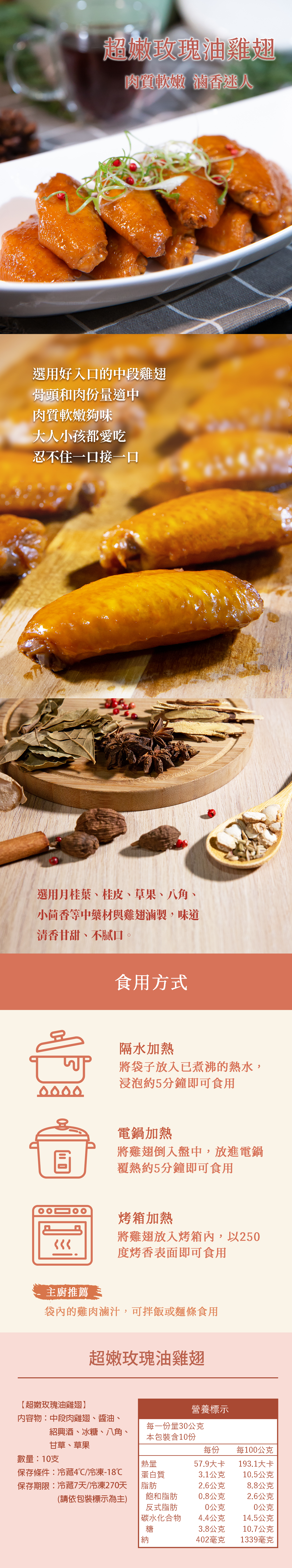 森菓宅食回購率第一名的人氣招牌美食, 每包十隻附醬汁(全部中段)只要放進開水中浸泡5分鐘,剪開即可成爲「餐桌主菜」。 如果再用烤箱250度烤香表面,馬上變成香噴誘人的「配酒菜」 原包雞肉原汁,肉質鮮嫩,香氣撲鼻,只採用Q彈帶脆的雞翅中段。港式油雞秋傳料理,大人小孩都愛吃,忍不住一隻接一隻,更可用作拌飯,拌麵,或製作另一道美味佳餚。